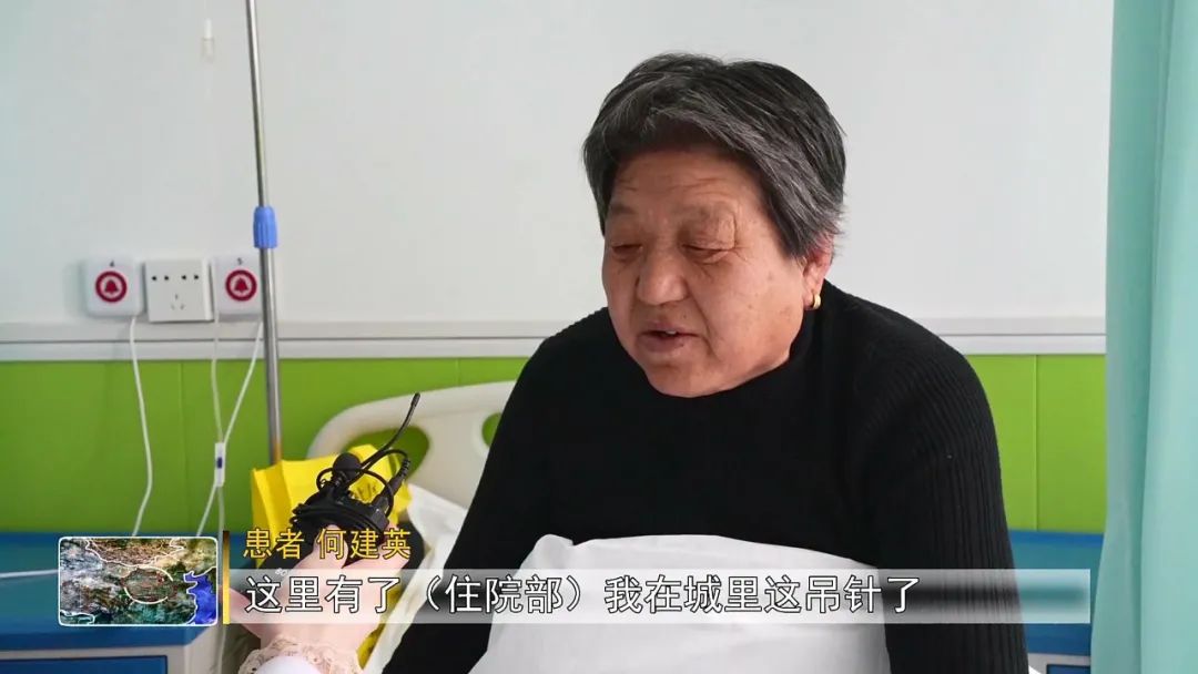 患者 何建英:我常吊针了,这里有了(住院部)我在这吊了,对我们来说可方便了,报销比例和乡镇上一样,对我们农村人就最好了。